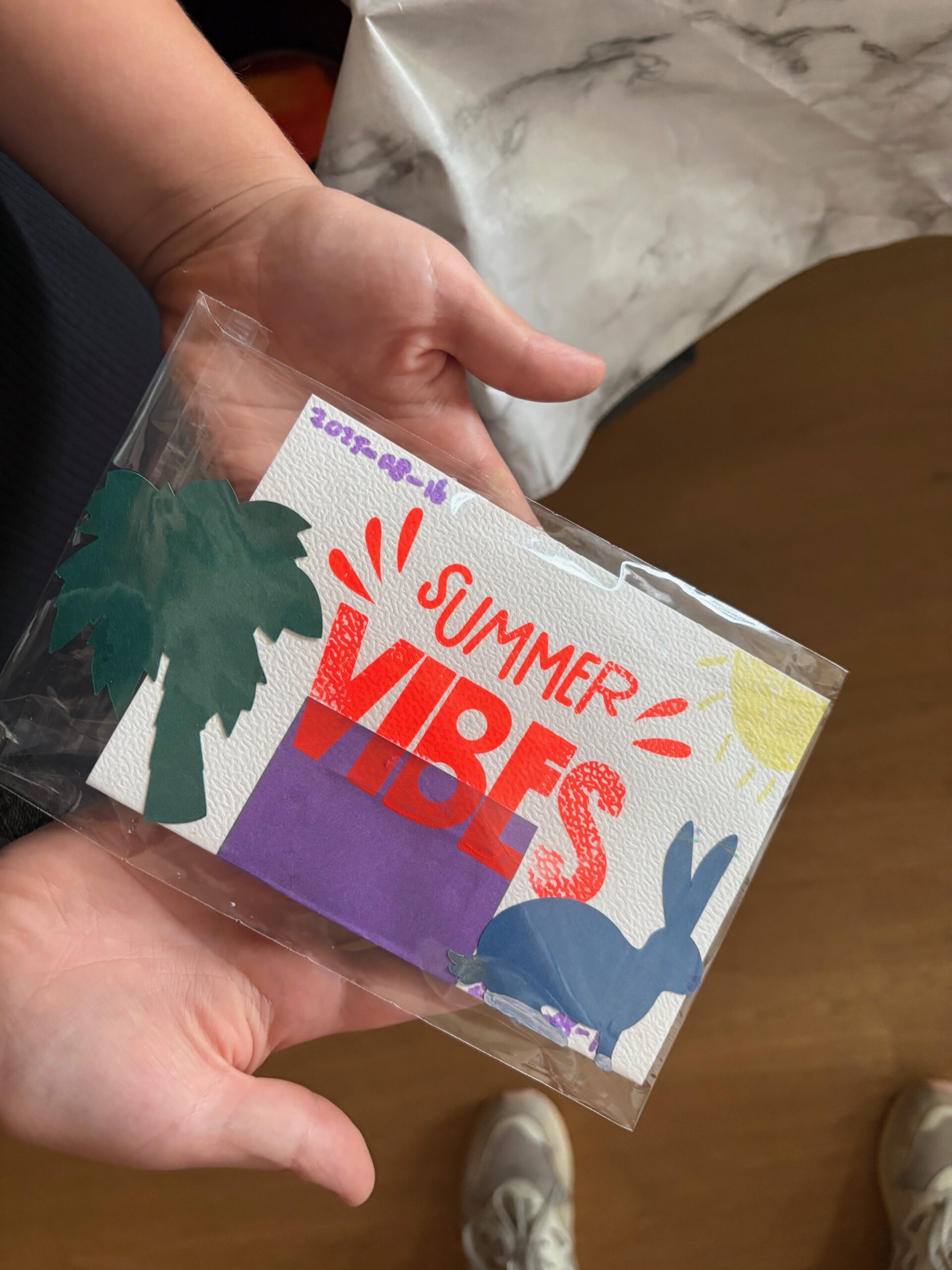 Have you always wanted to make your own cards? Now you can! We’ll screen print fun images onto the cards — but that’s not all. With shapes, markers, and paper, we’ll keep decorating! Make as many cards as you want.